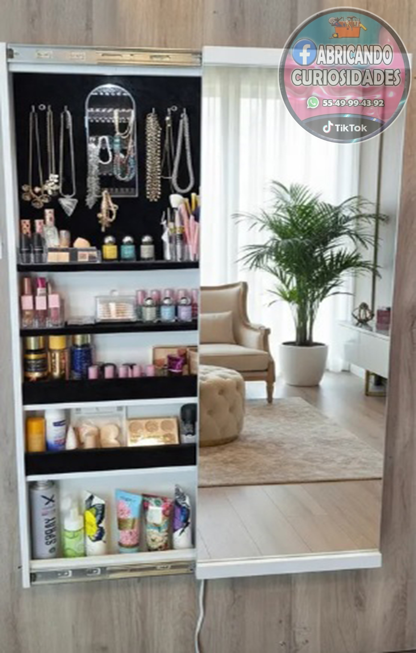 Optimice su espacio con este práctico espejo corredizo y gabinete de pared para almacenar joyas, accesorios y artículos de cuidado personal.